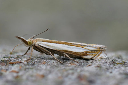 Detailed closeup on the Common European Grass-veneer, Crambus pascuella sitting on wood