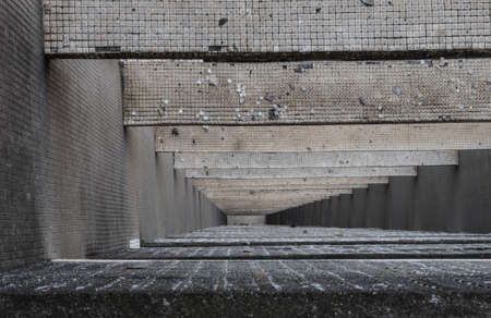 Abstract tunnel of painted concrete walls.
