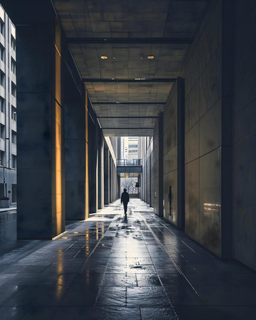 Silhouette in backlight walking in a long corridor