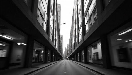 Urban canyon perspective between modern city buildings in monochrome
