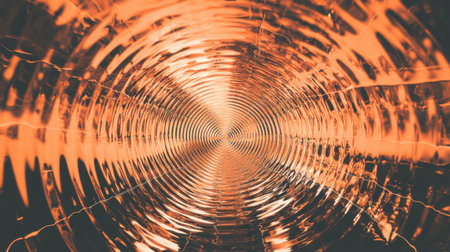 This image showcases a mesmerizing view of circular ripples inside a tube, illuminated by warm orange light, creating a captivating abstract pattern.