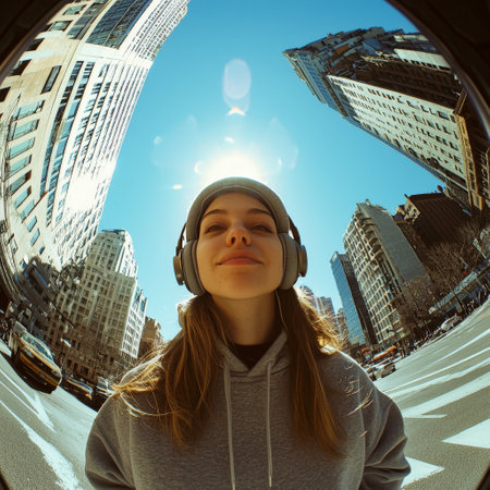 Playful portrait of young woman with fisheye lens in the city