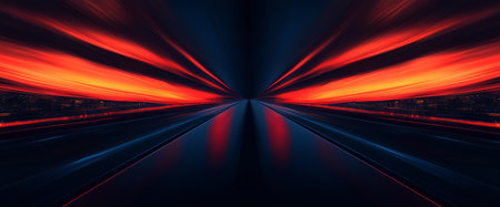 Futuristic red light speed highway. Dark background with intense red and orange light streaks creating a dynamic tunnel effect. Ideal for tech, sci-fi, and modern transportation themes.