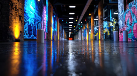 A long hallway with colorful graffiti on the walls. The hallway is lit up with neon lights and has a modern, urban feel