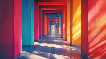 Warm and cold color contrast in a vibrant geometric corridor.