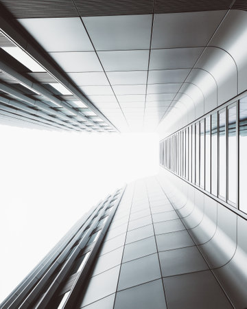 A striking view of a modern building's interior, showcasing vertical lines and a clear central aperture against a monochromatic backdrop.