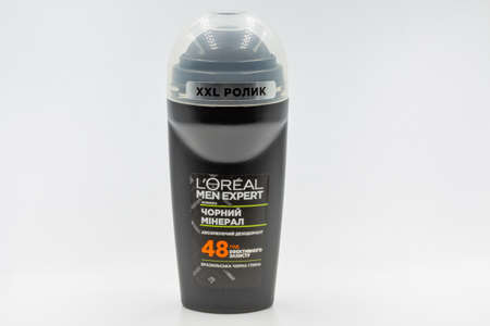 KYIV, UKRAINE - NOVEMBER 17, 2020: L'Oreal Paris Men Expert roll-on deodorant cosmetics closeup. It is a French company headquartered in Clichy, Hauts-de-Seine, world's largest cosmetics producer.