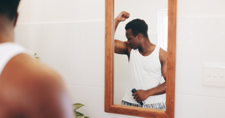 Mirror, cosmetics and man with deodorant smell for underarm hygiene, bad odor and sweat control. Reflection, black person and grooming routine for clean fragrance, getting ready and self care in home