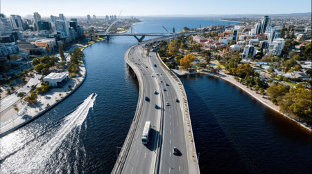 Explore a vibrant aerial view of Perth, Australia, showcasing a modern skyline, flowing river, and a sleek bridge beneath a clear blue sky.