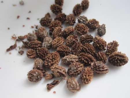 Side view on a small pile of organic textured spiny seeds scattered randomly on textile