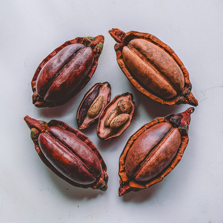 Open cocoa pod beans on a white background. Flat lay. Food concept. Macro concept