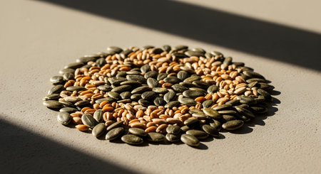 A neatly organized circular arrangement of pumpkin seeds and wheat grains on a textured beige surface. A diagonal shadow casts across the composition, highlighting the natural colors and healthy qualities of the ingredients.