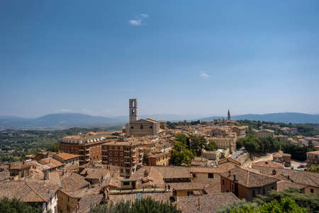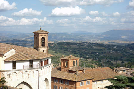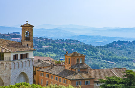 View of Umbria contryside from Perugia historic center roofs with old belfry