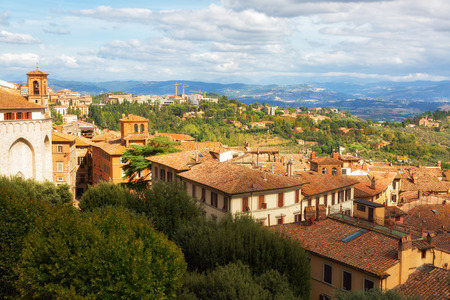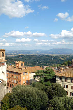 View of Perugia medieval historic center and Umbria countryside from city panoramic terrace