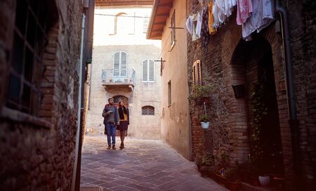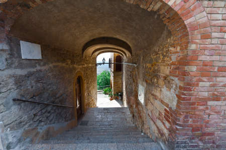 Narrow passage between old houses in Italy. Street with archway in the medieval italian town.