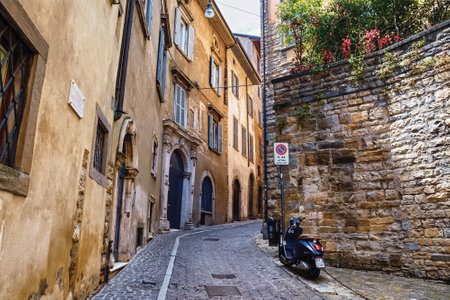 BERGAMO, ITALY - MAY 22, 2019: View of the old historic streets in Upper Bergamo (Citta Alta). Bergamo is a city in the alpine Lombardy region of northern Italy.