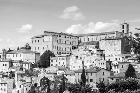 Historic buildings of Perugia, Umbria, Italy, at morning. Black and white