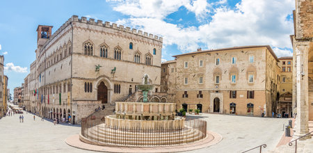 Perugia, Umbria, Italy. August 2020. Amazing view of Piazza IV Novembre with the historic fountain in evidence. Beautiful summer day, people in the square.