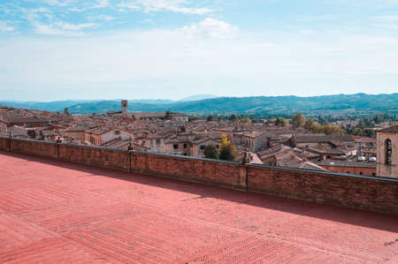 Panoramic view from a patio of the medieval Italian village of Gubbio with old buildings and constructions