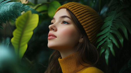 gorgeous woman over lush vegetation background, AI generated image