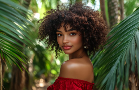A stylish young woman with afro, dressed in red, poses in lush tropical palm trees