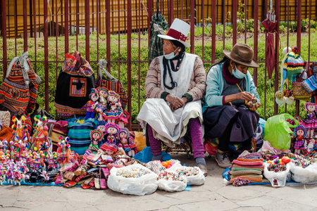 PERU - MAY 15, 2022: Peruvian people in traditional clothes in Cuzco. woman selling souvenirs. Cusco, Peru, May 15, 2022