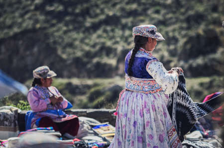 Traditional chola women selling colorful clothes in Colca canyon with sunlight. Peru. Southhamerica