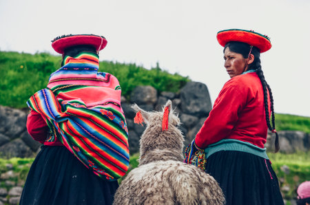Two traditional and colorful dressed Peruvian women with a llama in the Sacsayhuaman Inca archaeological site valley and ancient fortress outside Cusco, Peru, South America. January 17. 2014