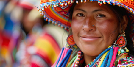 Vivid and colorful traditional Andean dance costumes, with intricate designs and accessories