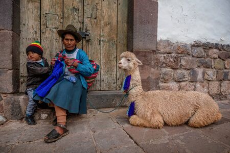 Cusco, Peru- March 17, 2017: Peruvian women with Alpaca near Cusco, Peru