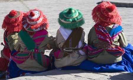 Three indigenous Peruvian women in colorful traditional dress and hats sitting together