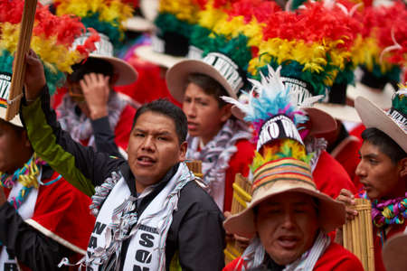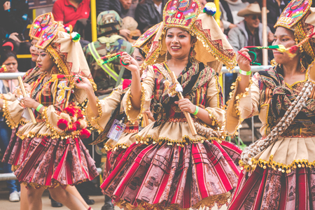 ORURO, BOLIVIA - FEBRUARY 26, 2017: Traditional folk dancers in ornate costumes performing as they parade through the mining city of Oruro on the Altiplano of Bolivia during the annual carnival.