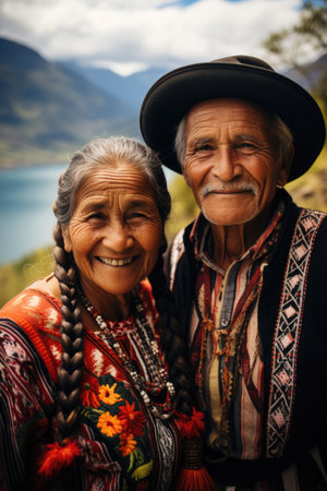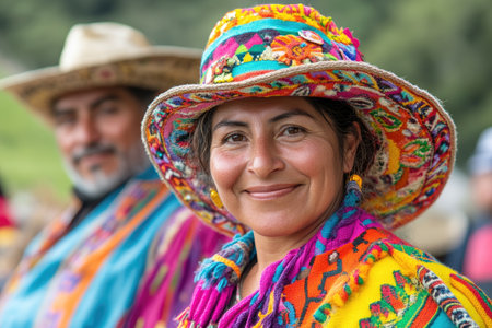 Portrait of smiling indigenous Quechua woman wearing colorful traditional Andean clothing and hat with man in background