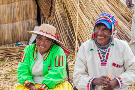TITICACA, PERU - MAY 15, 2015: Inhabitants of Uros floating islands, Titicaca lake, Peru