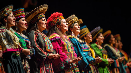 A cultural performance showcasing a choir in traditional costumes, singing songs that reflect their heritage, creating a vibrant celebration of music and cultural identity.