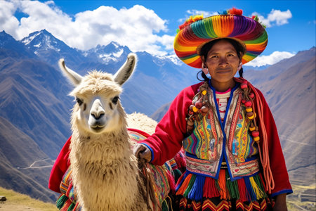 A Captivating Sight: Peruvian Woman Embracing Tradition with Llama by the Majestic Ande Mountains on the Road to Machu Picchu
