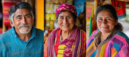 Portrait of three smiling south American sellers wearing colorful traditional clothes