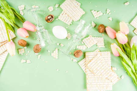 Pesah celebration concept. jewish Passover holiday background with matzo, eggs, spring flowers, wine, green background copy space top view