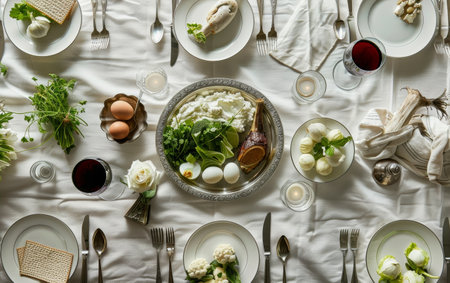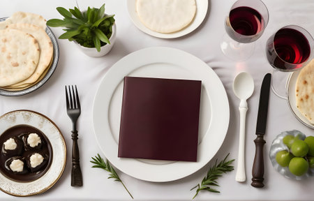 Table served for Passover (Pesach) indoors, with matzah bread as symbolic Pesach (Passover Seder) item.