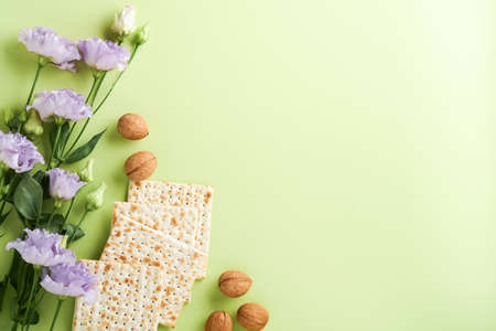 Passover celebration concept. Matzah, red kosher wine, walnut and spring beautiful rose flowers. Traditional ritual Jewish bread on light green background. Passover food. Pesach Jewish holiday.