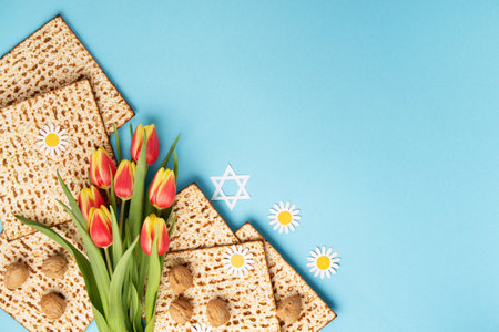 jewish holiday of Passover and its attributes, with matzo and spring tulips - Happy Passover