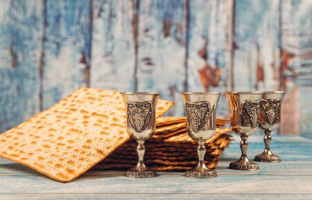 Jewish holidays: Passover (Pesach) matzah and a silver cup full of wine with a traditional blessing Borei Pri HaGafen engraved on it.