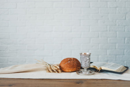 Holy communion chalice with wine, bread, and Bible. Lord's supper.