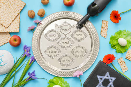 Pesach Jewish holiday. Passover celebration concept. Matzah, red kosher wine and walnut. Traditional ritual Jewish bread on light blue background. Passover food.