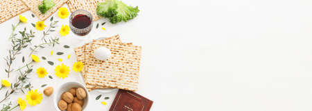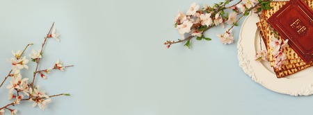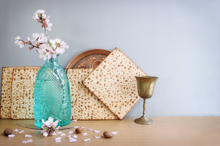 Passover celebrating of great Jewish family holiday symbols with traditional kosher matzah