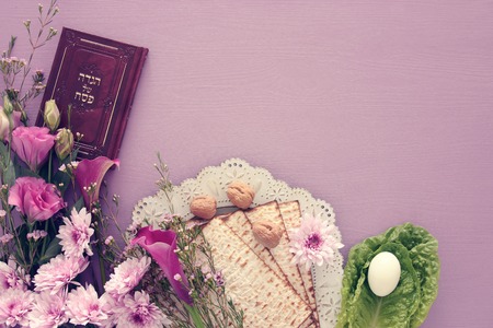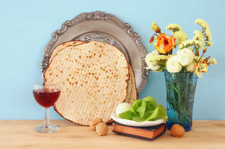 Pesah celebration concept (jewish Passover holiday) over wooden table