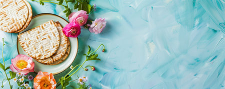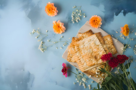 Jewish traditional matzah bread with flowers on a blue background, copy space, Passover, Generative AI content
