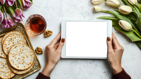 An invitation to the Jewish Passover. A woman is holding a tablet with a white screen, top view, close-up. A tablet moccap surrounded by Jewish matzo cakes, a glass of wine, walnuts and spring flowers.