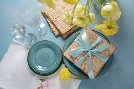 Passover pale blue background with matzo and spring flowers ranunculus. Space for text. Banner.