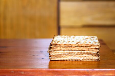Pile of jewish Passover matzah unleavened bread. Symbols of Passover-Jewish Matza. Table setting at home. Pesach celebration.